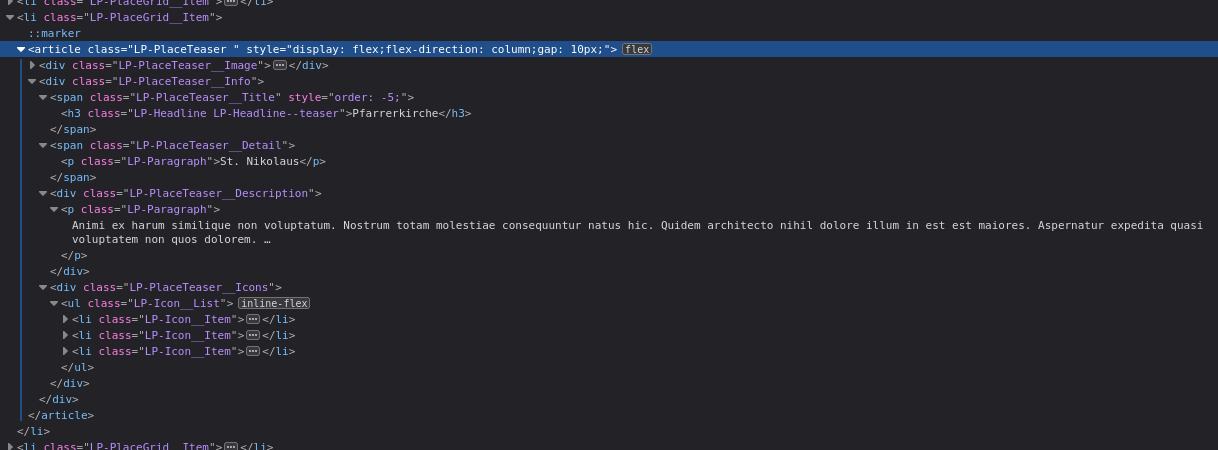 The headline in the place teaser should be place above the image, but only when the teaser is in vertical orientation. Also change h1 to h3. See screenshot for example markup